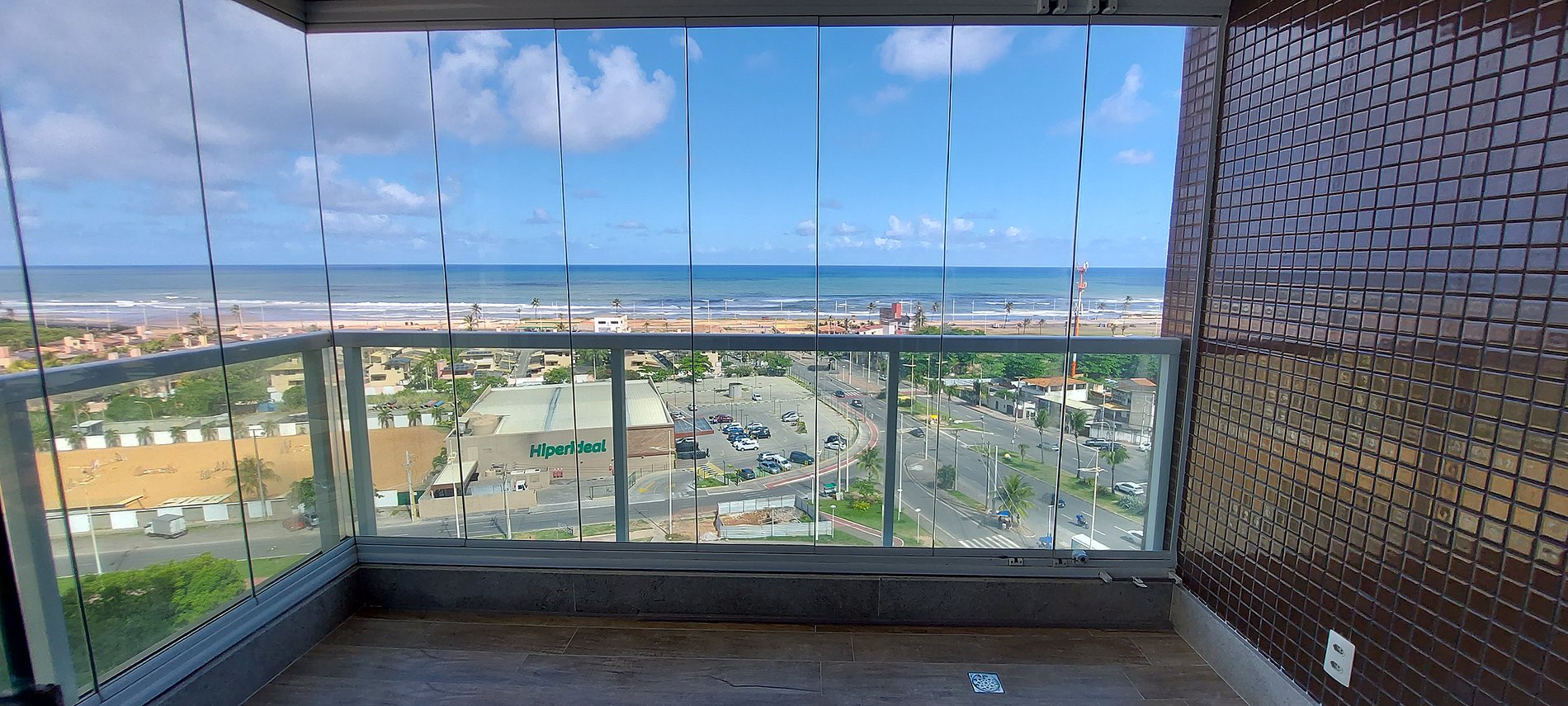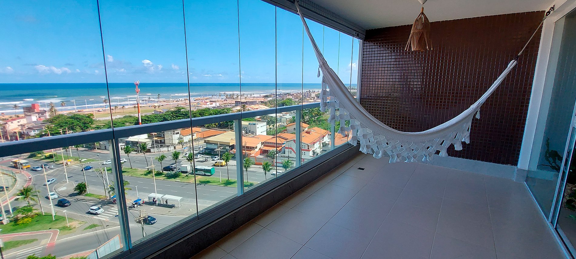 - SUITE 1: cama queen, sofá-cama casal, prateleiras com organizadores, mesinha de canto redonda e mesa de canto quadrada, cortina blackout, armários, ar condicionado split, varanda grande com vista mar, banheiro com pia, box, espelho, mini varal, chuveiro climatizado