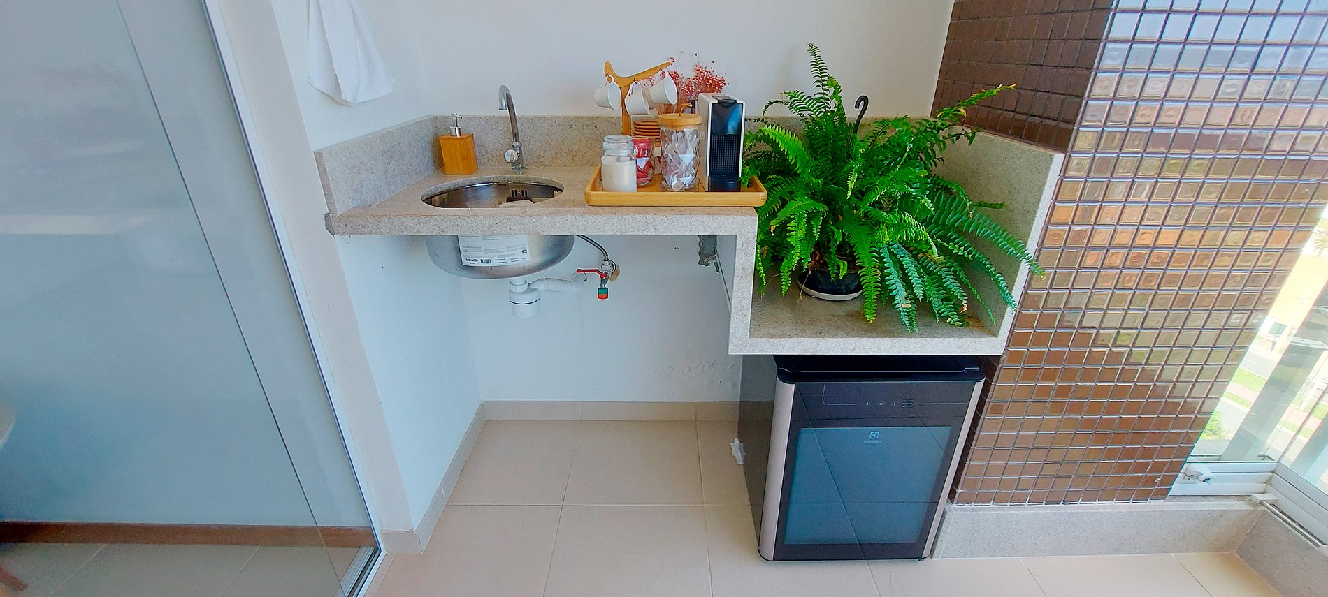 - Varanda da sala com rede de descanso, "cantinho do café", frigobar, pia