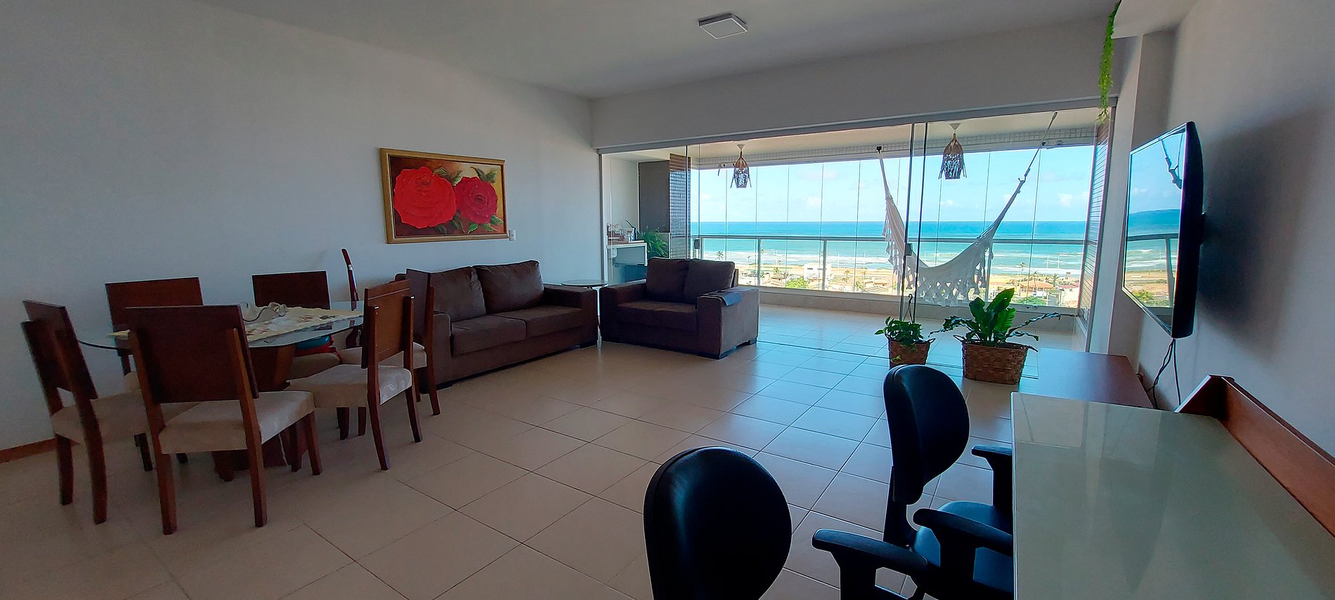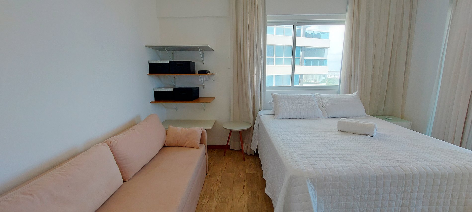 - SUITE 1: cama queen, sofá-cama casal, prateleiras com organizadores, mesinha de canto redonda e mesa de canto quadrada, cortina blackout, armários, ar condicionado split, varanda grande com vista mar, banheiro com pia, box, espelho, mini varal, chuveiro climatizado