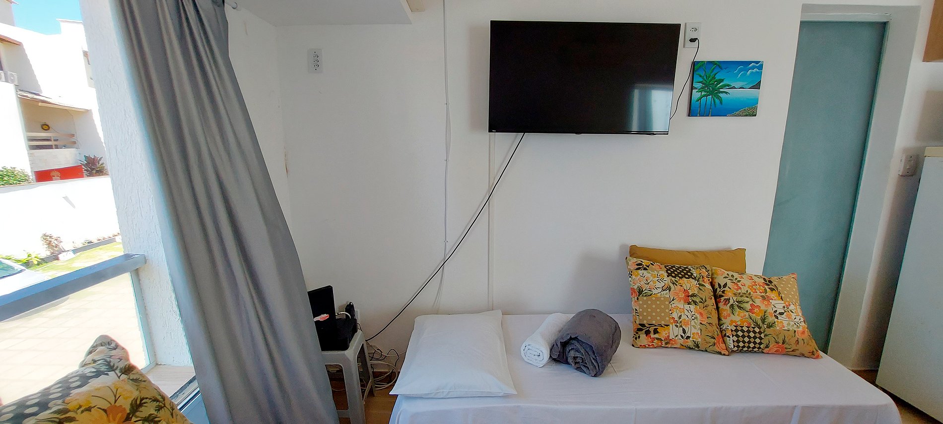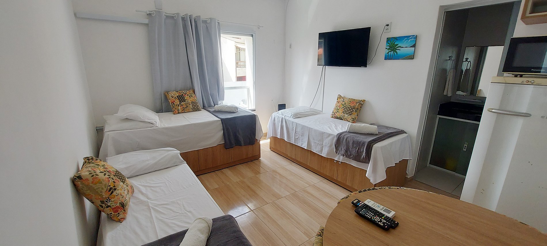 Condomínio residencial simples com saída direto na praia, estacionamento, churrasqueira coletiva. Apartamento com vista lateral do mar. Possui smart TV, WIFI 60MB, ar-condicionado split e ventilador de teto.