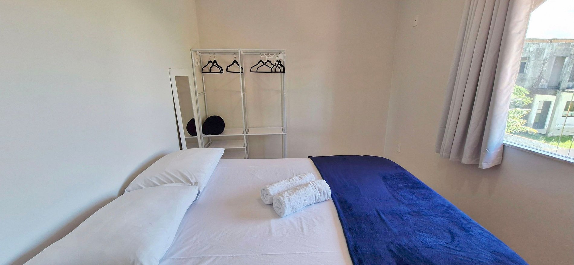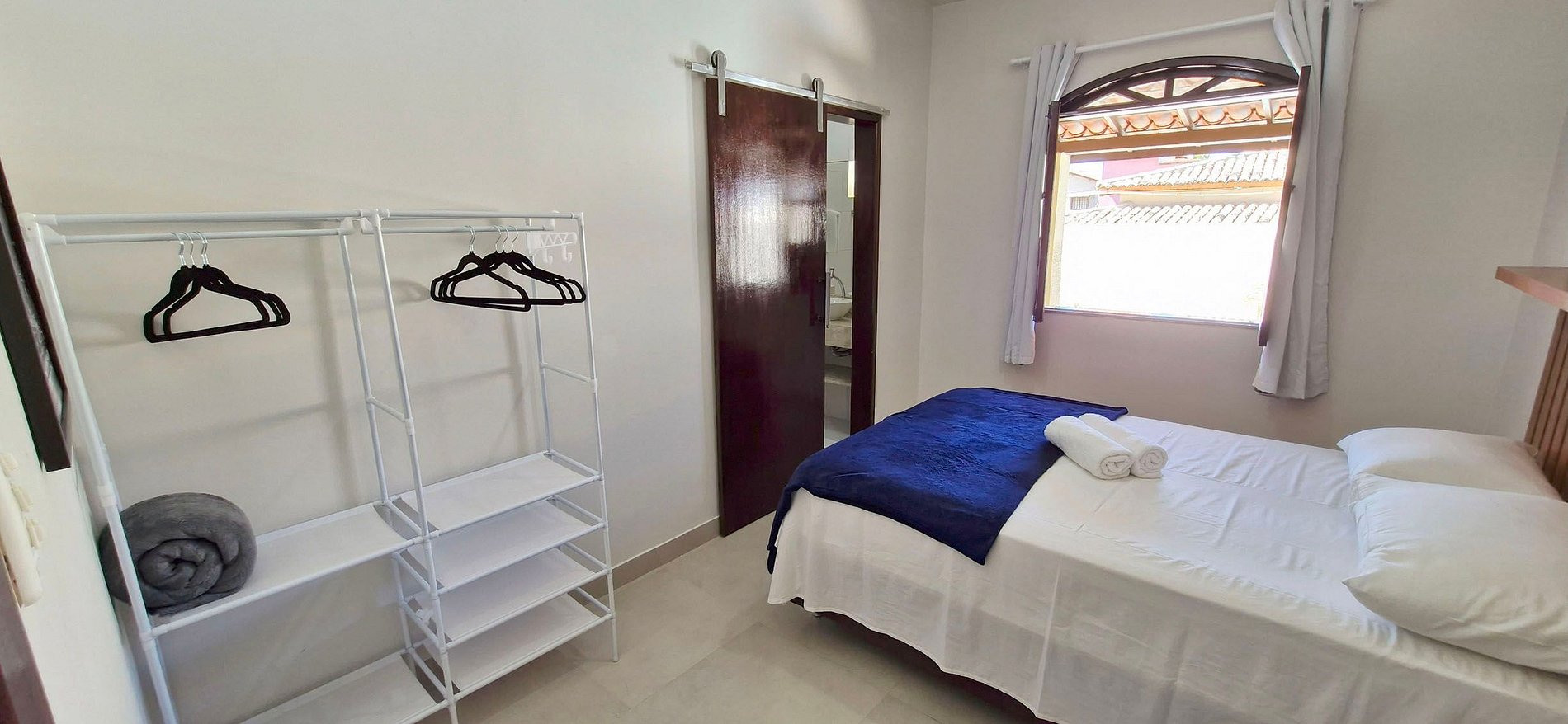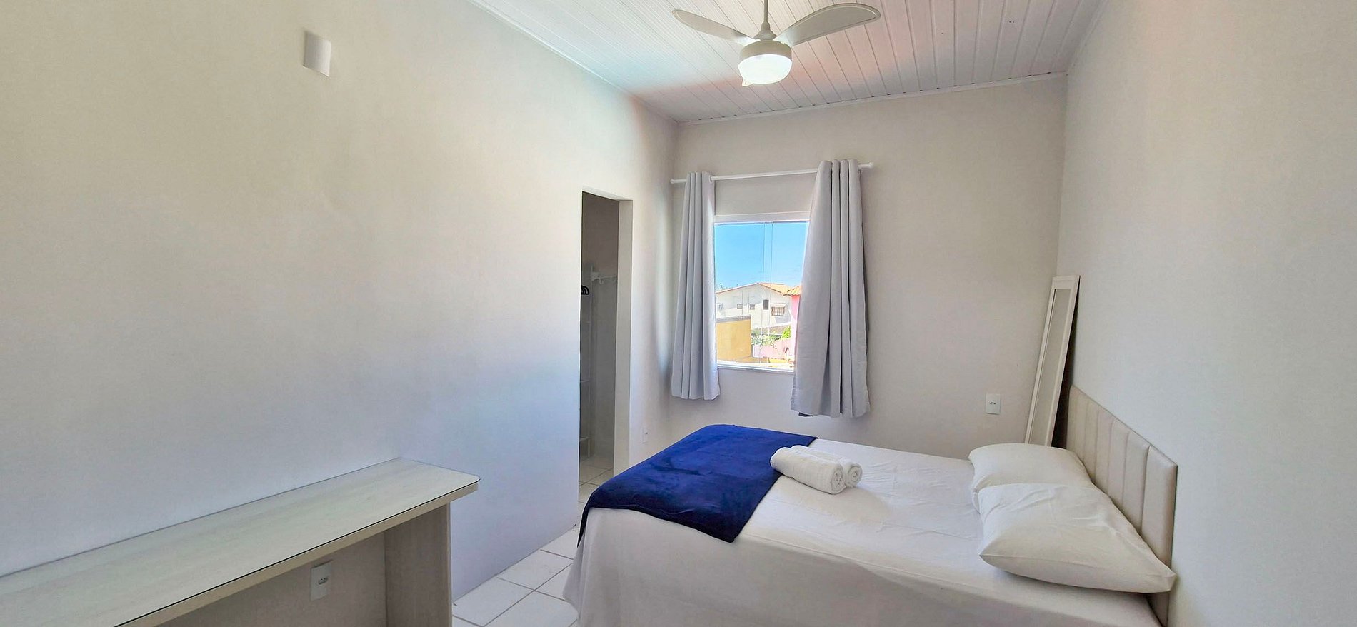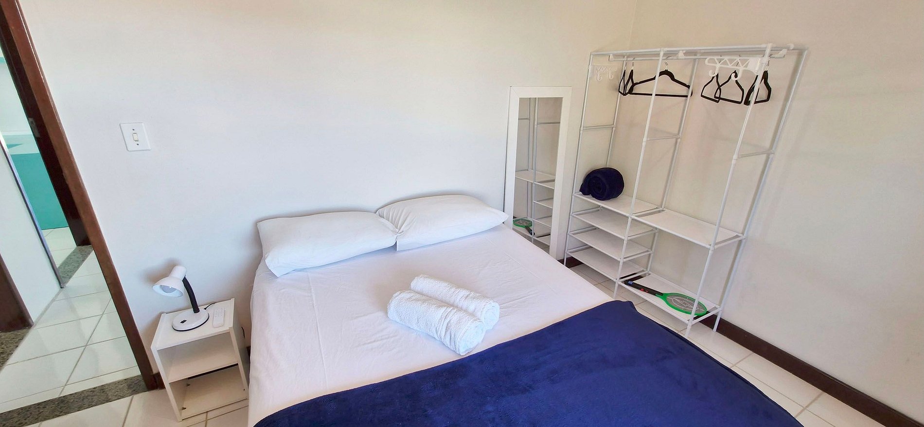 - Cama de casal, mesinha de cabeceira com abajur, ventilador de teto cortina blackout, cabideiro, banheiro com box e chuveiro elétrico