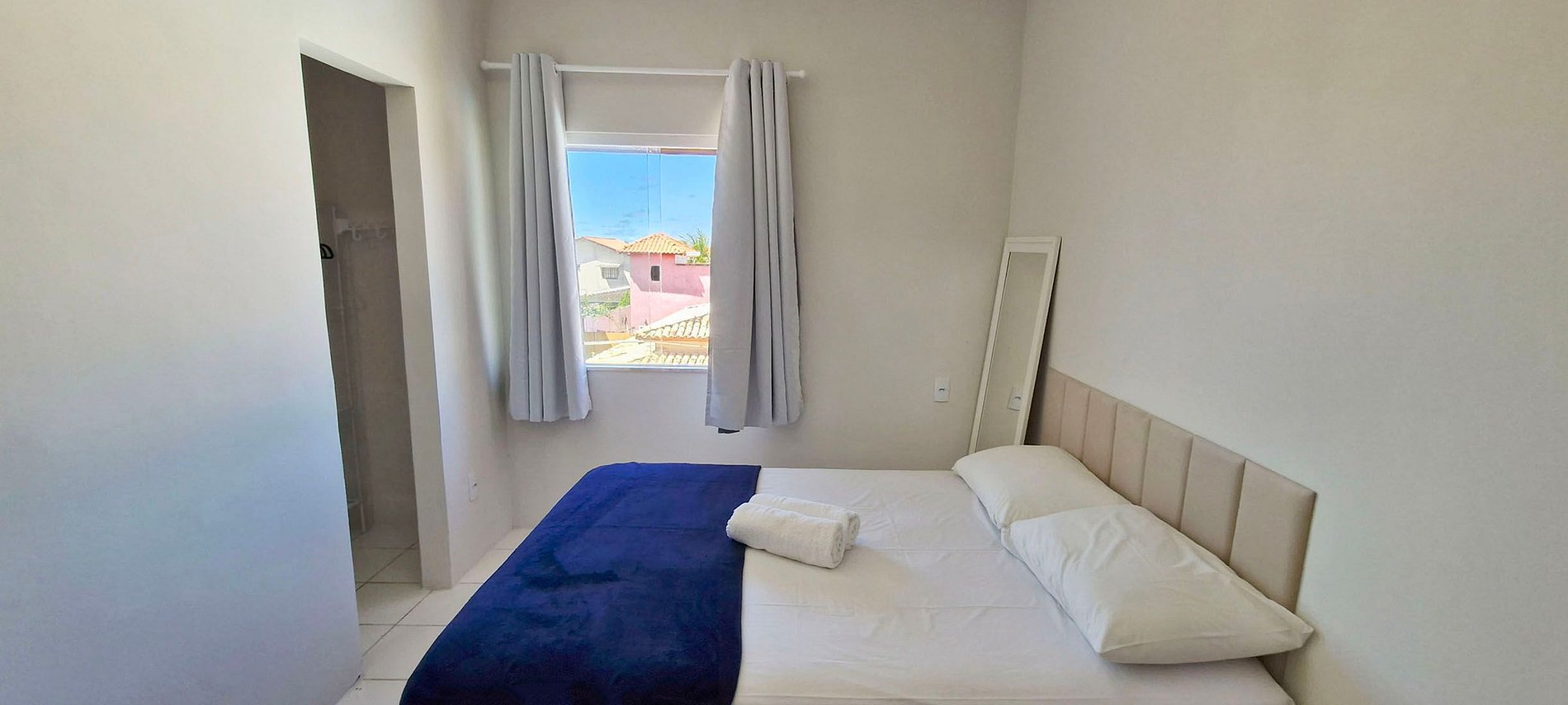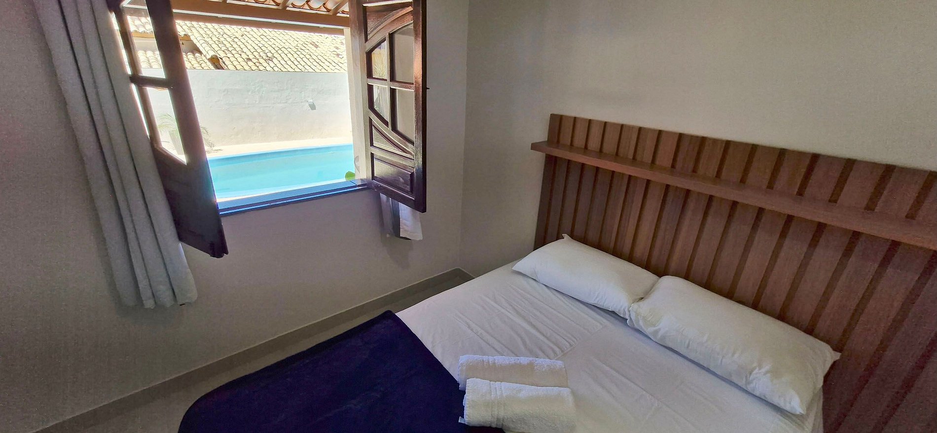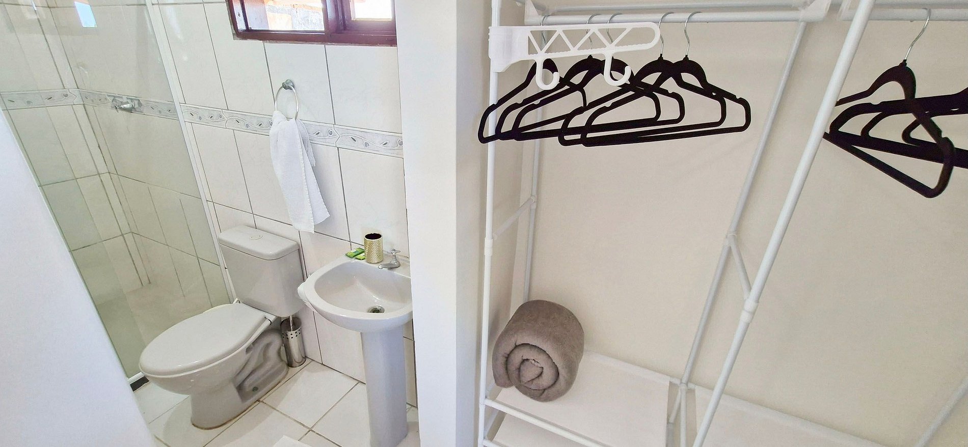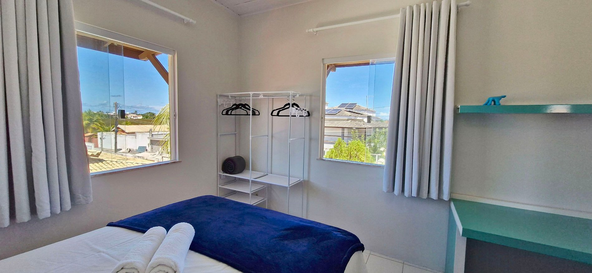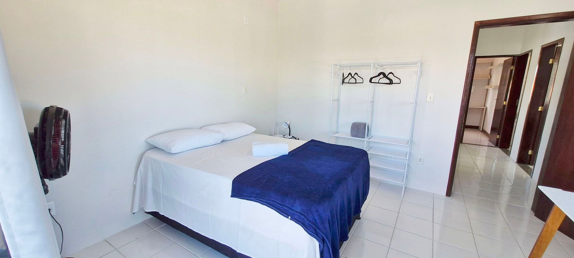 - Cama de casal, mesinha de cabeceira com abajur, ventilador de teto cortina blackout, cabideiro, banheiro com box e chuveiro elétrico