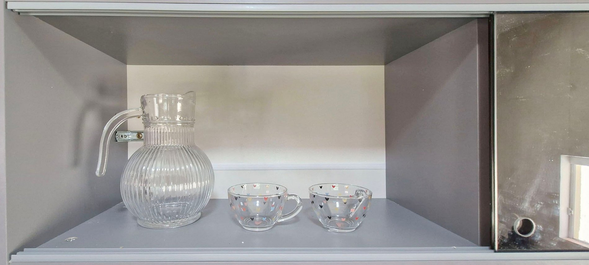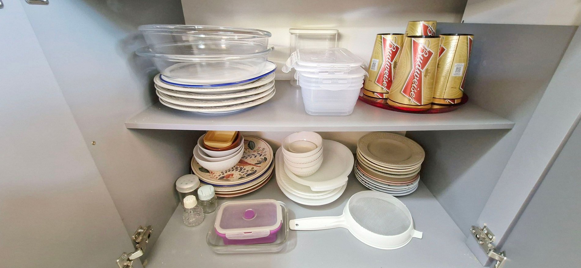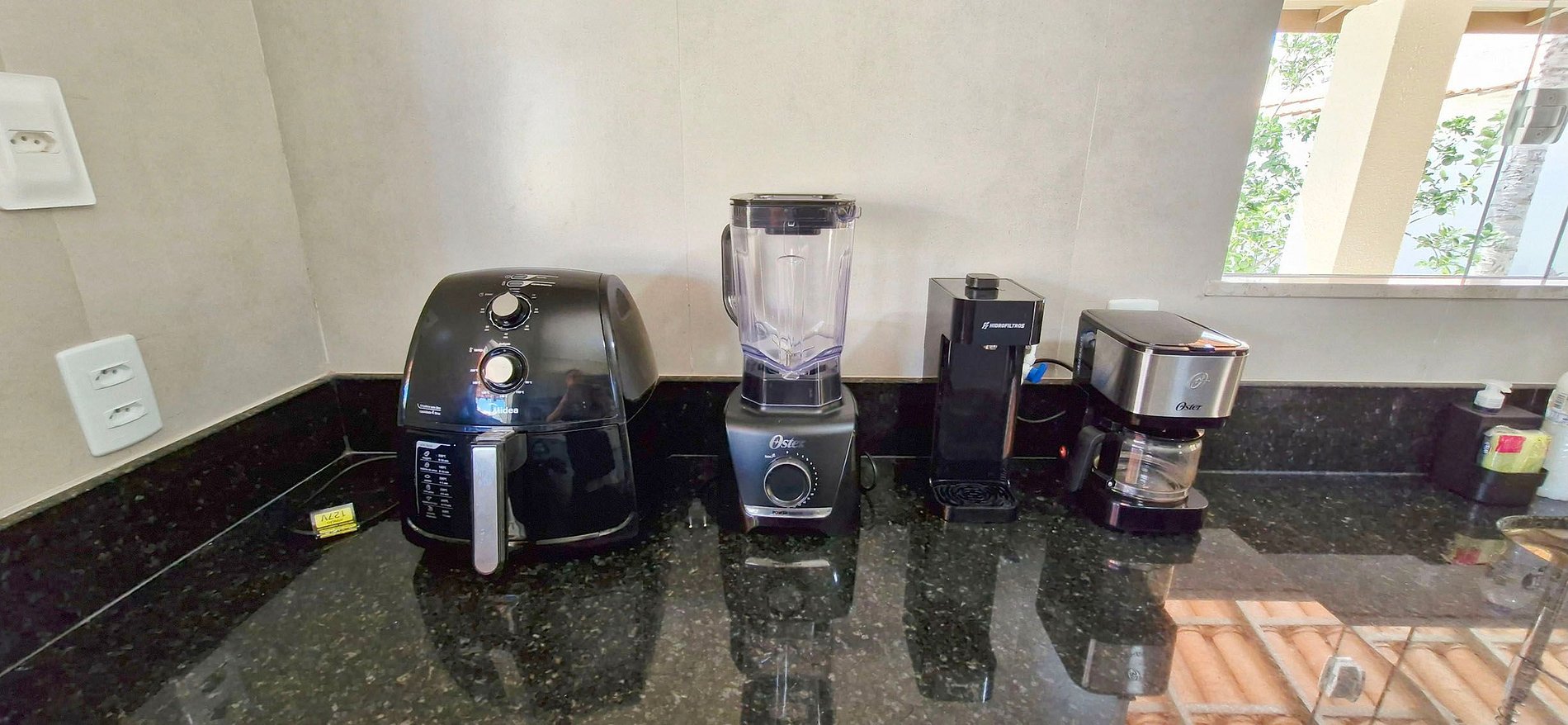 - Geladeira duplex, fogão a gás, airfryer, liquidificador, filtro de água, cafeteira elétrica, microondas, panelas, potes, copos, taças, talheres e itens básicos de cozinha