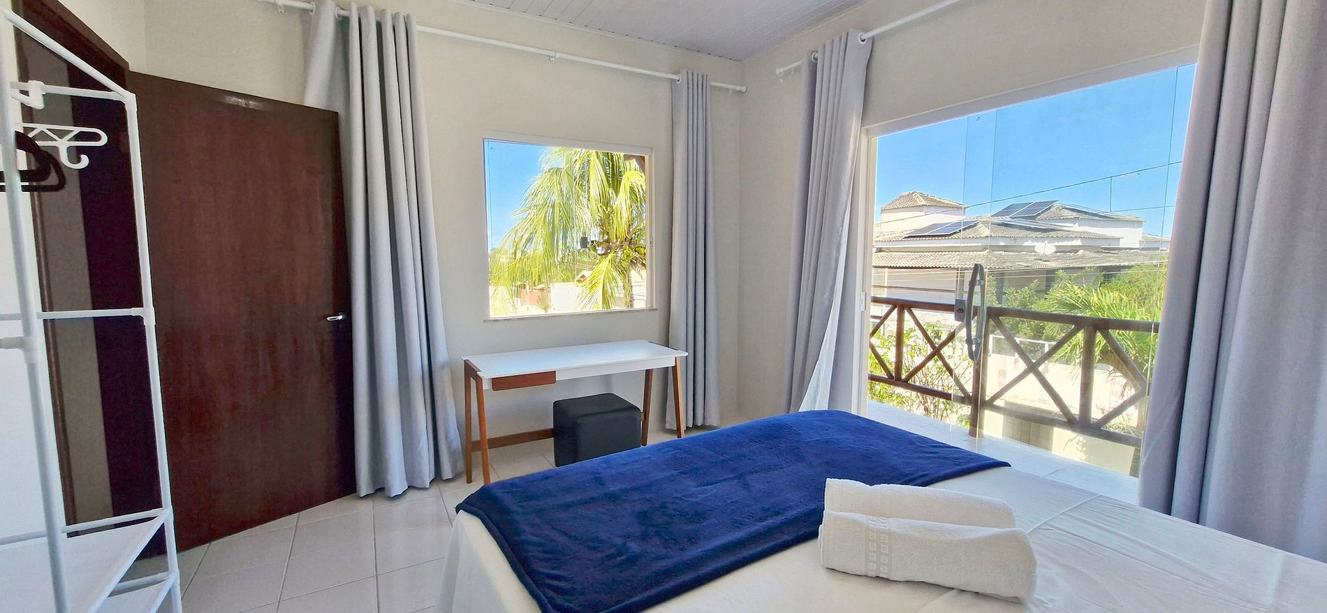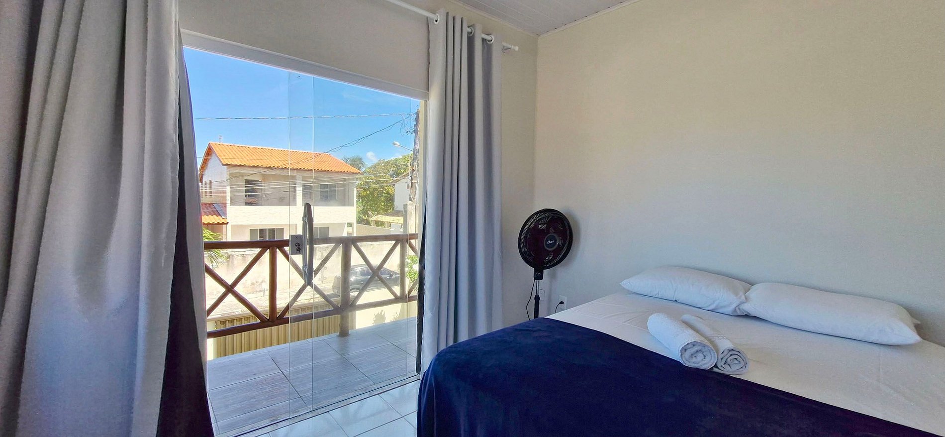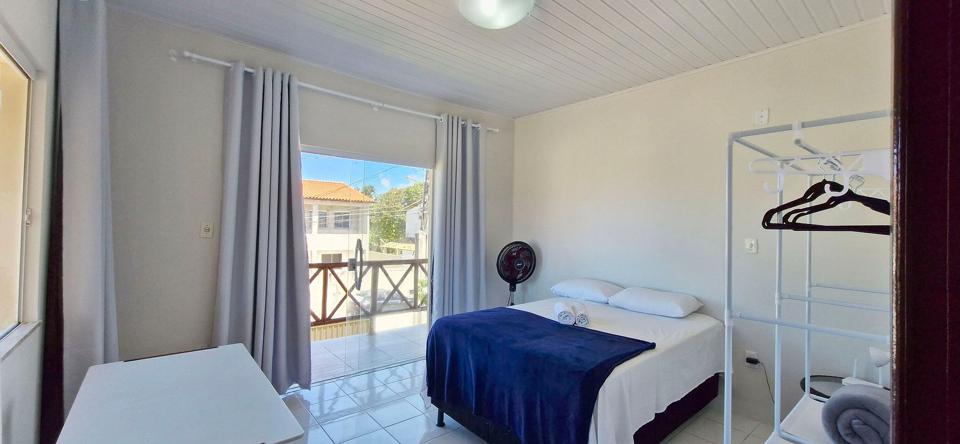 - Cama de casal, cortina blackout, mesinha de cabeceira com abajur e modem wi-fi, mesa com banco, ventilador de pé, cabideiro, varandão