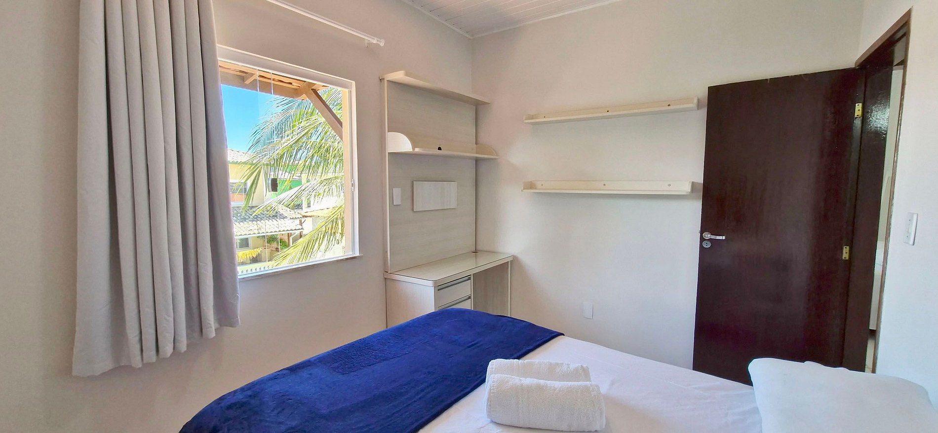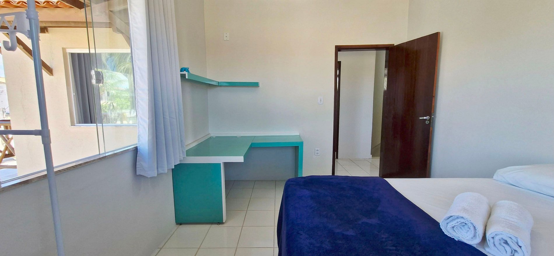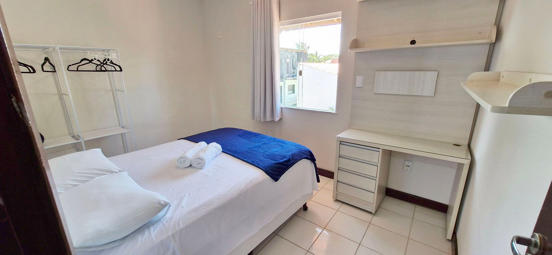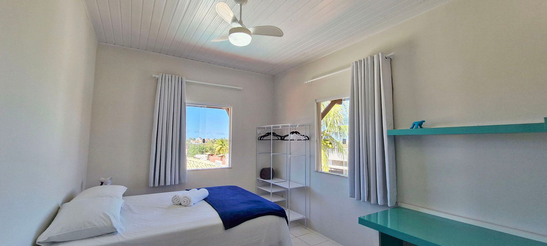 - Cama de casal, cortina blackout, mesinha de cabeceira com abajur, ventilador de teto, mesa de estudo, cabideiro