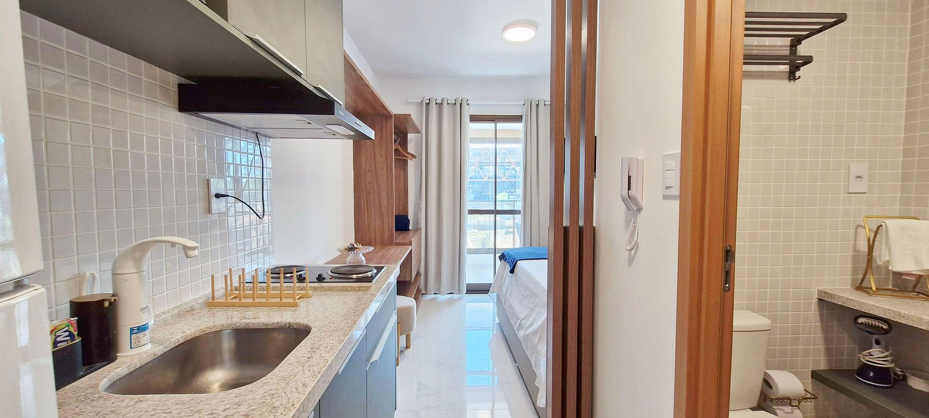Pertinho do Centro de Convenções e da praia! Condomínio com piscina na cobertura com vista mar, academia, coworking com sala de reunião, garagem rotativa e recepção 24hs. Lavanderia com cobrança à parte. Ao lado do supermercado Hiperideal, farmácia, bares e restaurantes. Com cama casal, smart TV com antena local, WI-FI, ar condicionado split, varanda e cozinha.