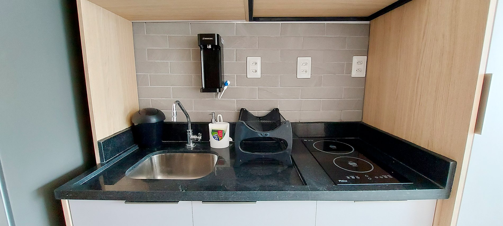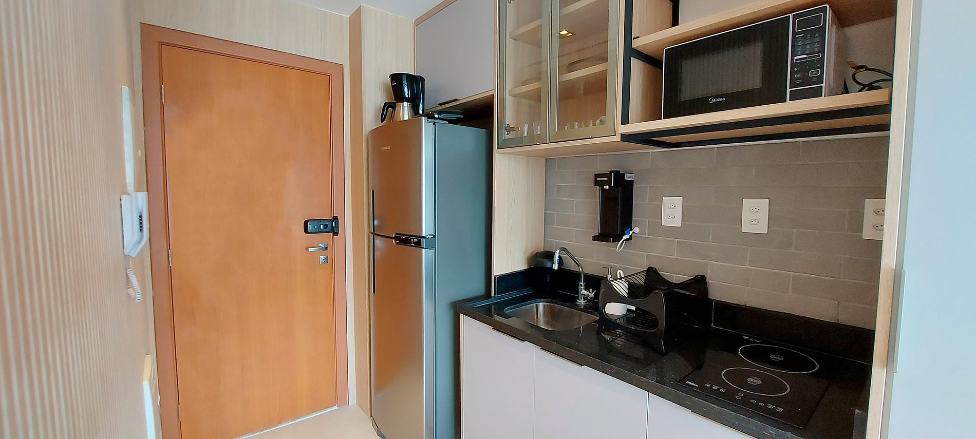 - Cozinha com filtro de água, sanduicheira, cafeteira elétrica, geladeira duplex, microondas e fogão duas bocas de indução