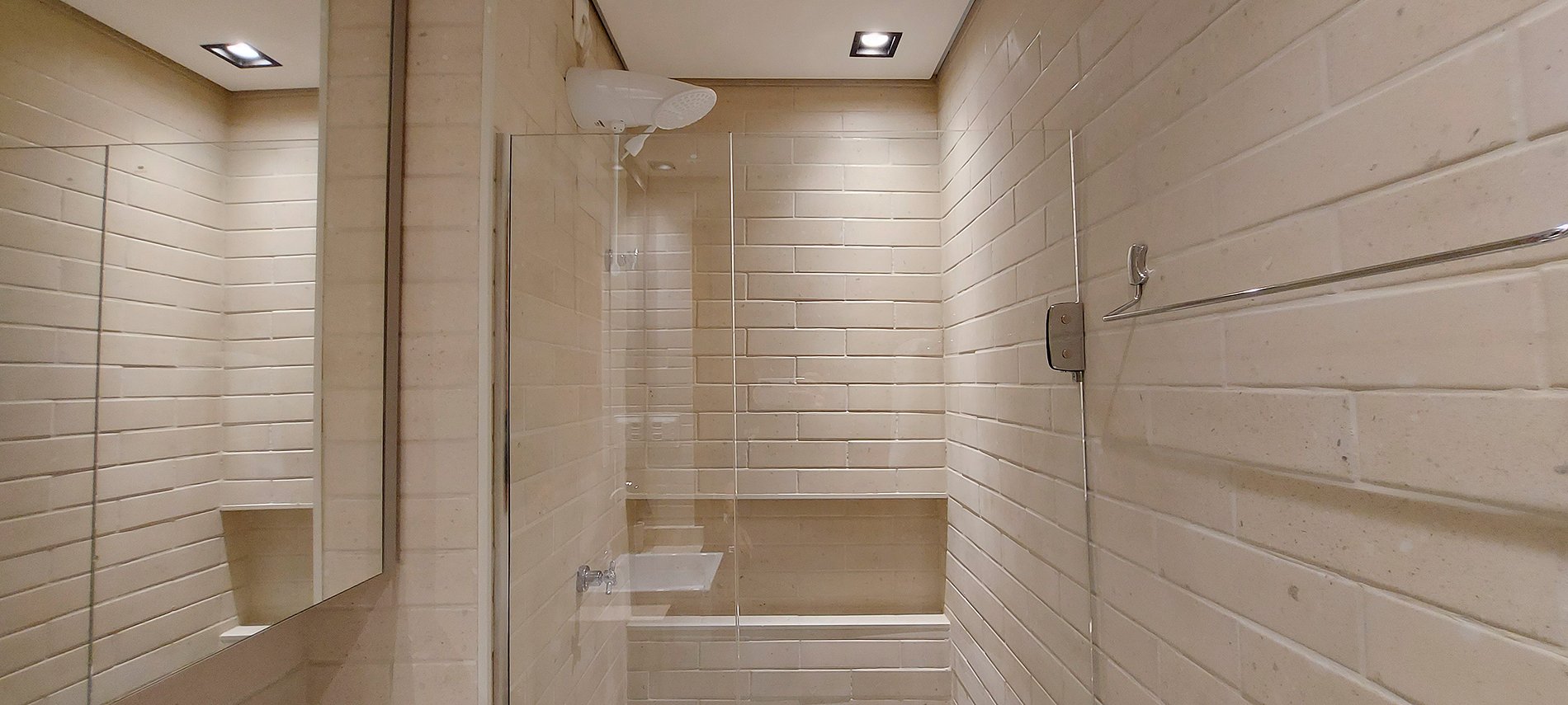 - Banheiro com armário, espelho, box e chuveiro elétrico
