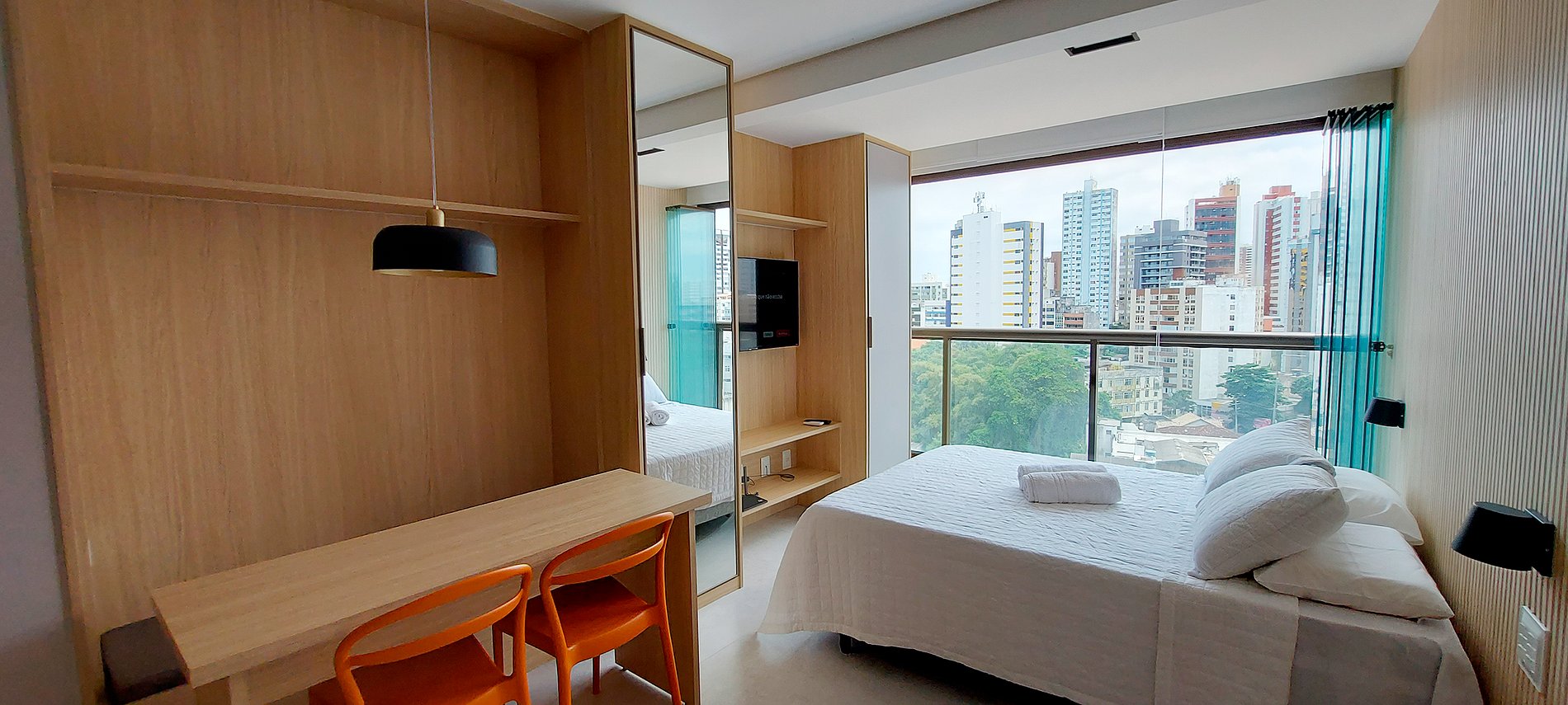 - Espaço com cama casal, guarda-roupa com espelho grande, ar condicionado split, janela Reiki com cortina blackout, smart TV com canais locais, WI-FI, mesinha de madeira e banco para duas pessoas, 2 cadeiras laranjas,