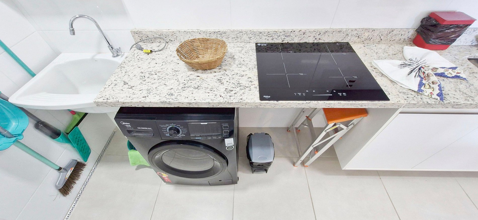 - Área de serviço com pia, máquina de lavar, ferro de passar, tábua de passar, varal de pé, vassoura, rodo e pá