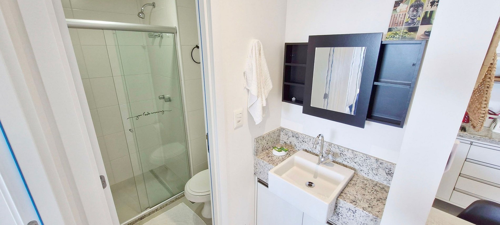 - Banheiro com box, chuveiro com aquecimento controlado pelo prédio, ducha higiênica