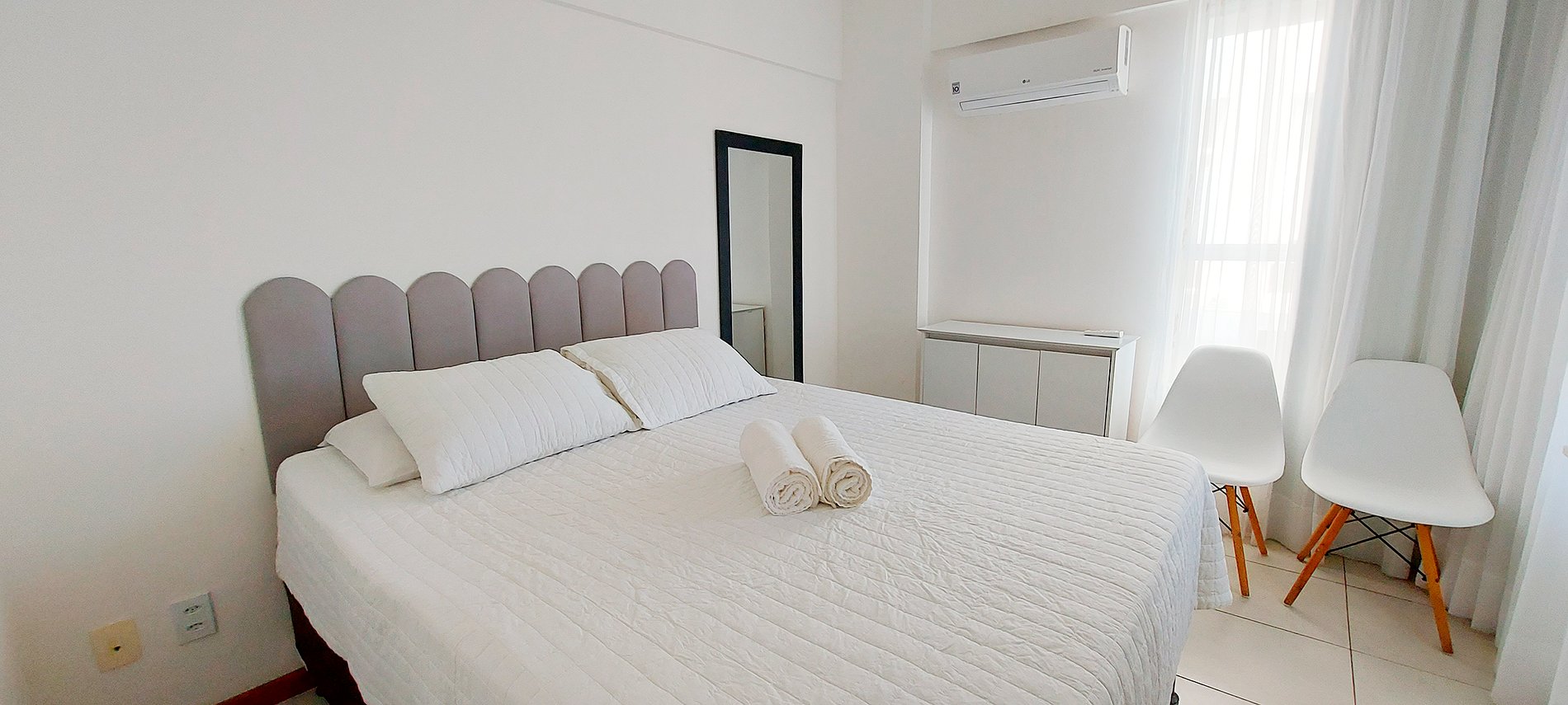 - Quarto com cama queen, guarda-roupa, espelho grande, cômoda, ar condicionado split, cortina blackout, 2 cadeiras brancas