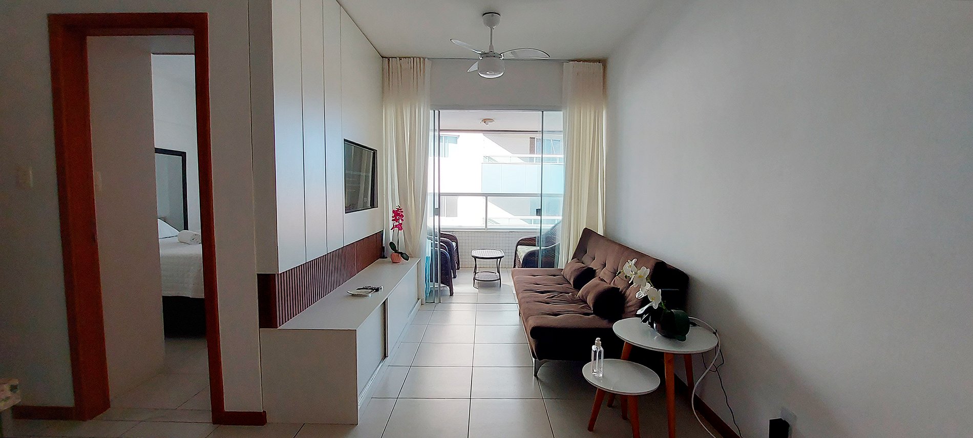 - Sala de estar com sofá-cama casal, 2 mesinhas de canto redondas, rack, smart TV com Claro TV, WI-FI, cortina