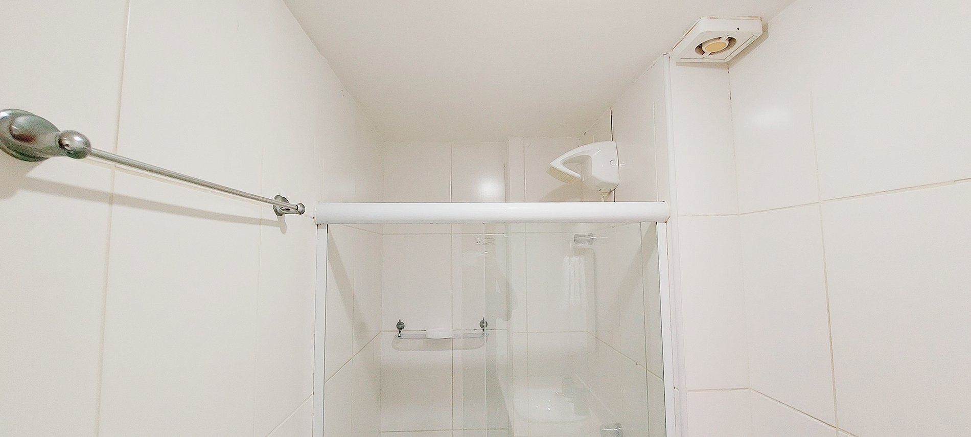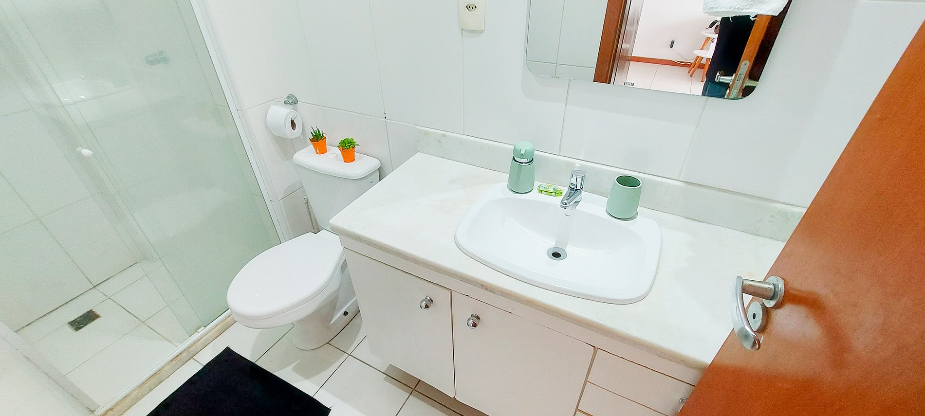- Banheiro com armário, ferro de passar, espelho e chuveiro elétrico