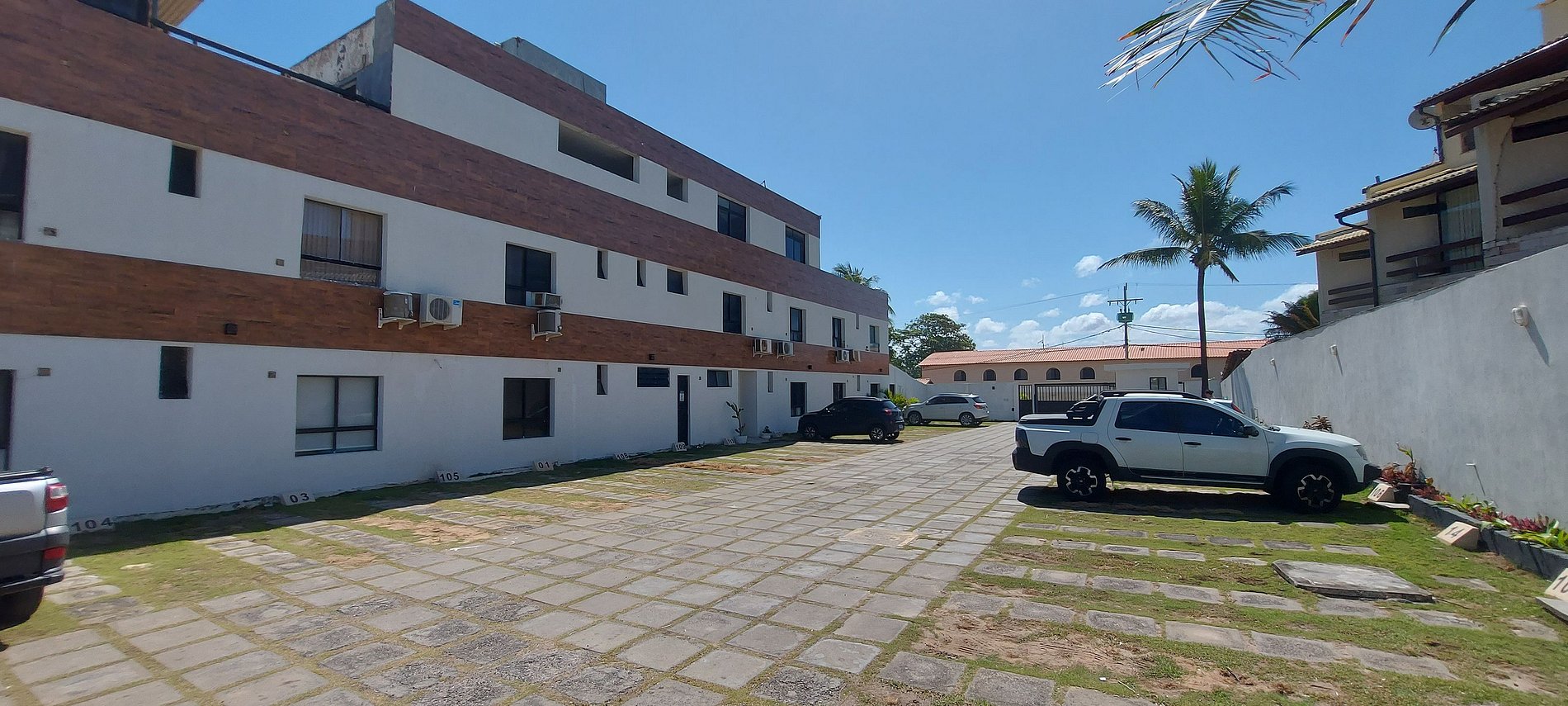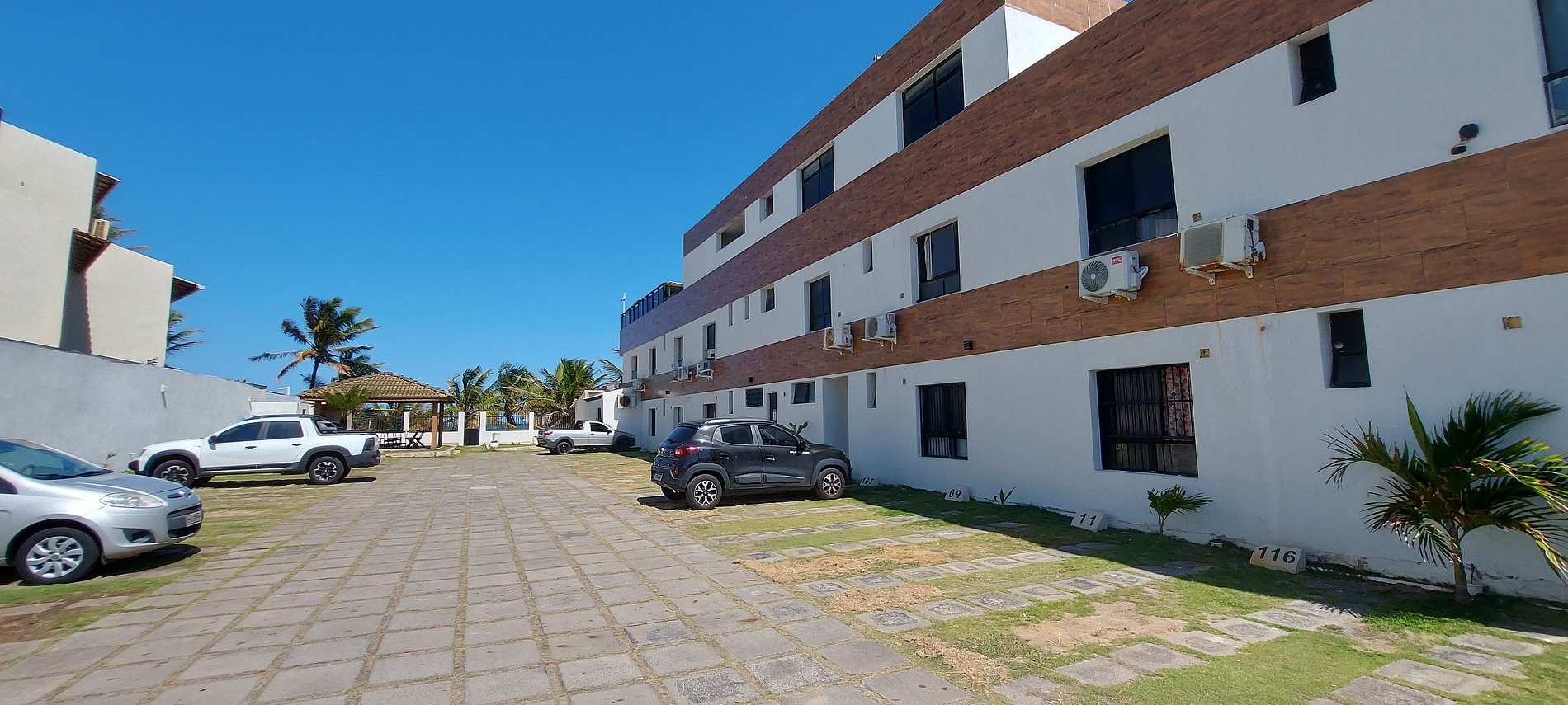 Pé na areia. Condomínio residencial bem simples com portão de acesso direto na areia da praia. 1 garagem particular para cada apartamento. Não tem elevador.