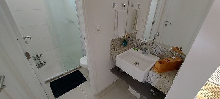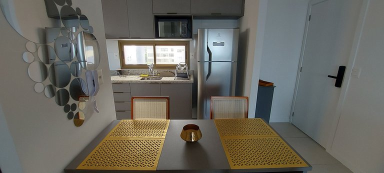 - Cozinha completa com filtro de água, liquidificador, cuscuzeira, cafeteira elétrica e de cápsulas, airfryer, fogão cooktop 2 bocas, geladeira duplex, microondas, forno elétrico