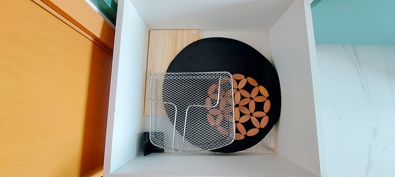- Cozinha completa com geladeira duplex, cooktop com 2 bocas, filtro de água, bancada com dois banquinhos, cafeteira elétrica, microondas, sanduicheira, liquidificador, airfryer (importante manter a tábua de madeira embaixo dele ao utlizar para evitar aquecimento) e itens básicos de cozinha.